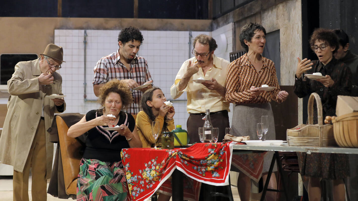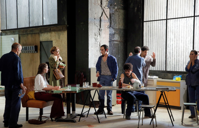 Le rythme ici est donné par l’alternance et l’entremêlement de scènes intimistes – l’histoire d’un jeune couple, de la rencontre des protagonistes à leur mariage – à des scènes de groupe, familial et de travail, et à la naissance de l’idée d’autogestion puis à ses débuts de réalisation dans l’usine qui emploie le personnage principal incarné par Mikaël Treguer (le jeune ouvrier) issu comme quelques-uns de ses camarades du plateau de l’École de la Comédie de Saint-Étienne. Un authentique feuilleton (c’en était d’ailleurs un à la télévision !), plongé dans un bain d’optimisme un rien idéaliste : cela se passe chez Fassbinder dans les années 1970 en Allemagne. Cette fiction dramatique de l’époque réagencée par Julie Deliquet elle-même, avec le concours de Julie André et de Florence Seyvos, à partir de la traduction de Laurent Mulheisen, n’est pas sans rappeler Les Vivants et les morts de Gérard Mordillat qu’avait mis en scène il y a plus d’une dizaine d’années Julien Bouffier. Dans le monde ouvrier, le monde n’a guère changé.