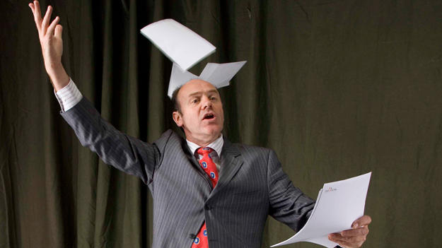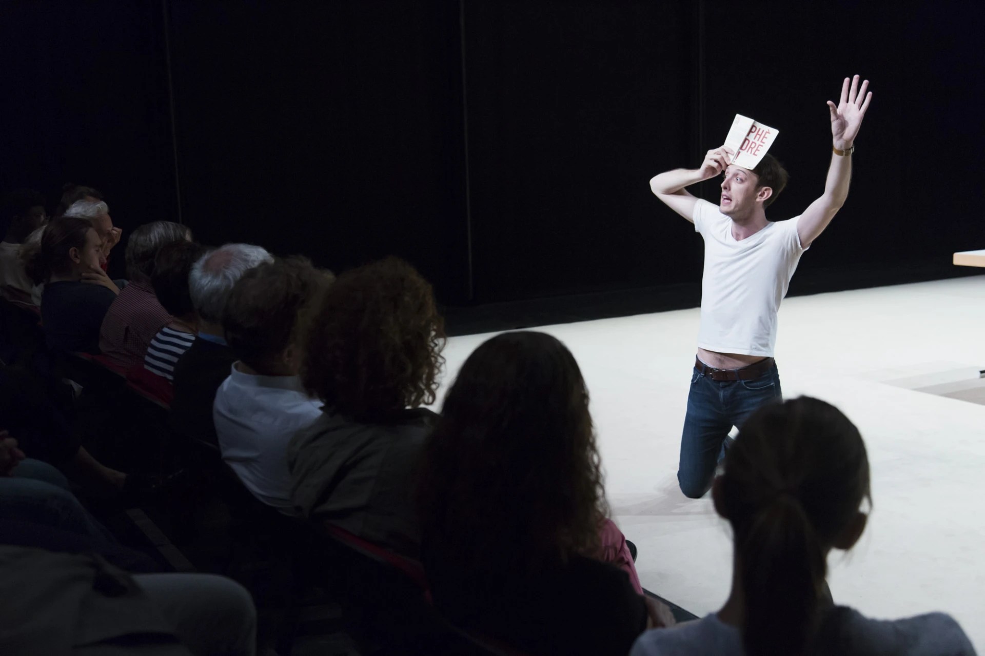 François Gremaud, par la bouche de son interprète Romain Daroles, a bien raison de nous prévenir qu’il y a dans son spectacle deux Phèdre distinctes, celle de Racine, bien évidemment, à laquelle ensuite il rajoute un point d’exclamation au titre et devient ainsi celle de sa propre proposition. Côté Phèdre de Racine, Romain Daroles s’empare tranquillement de tous les rôles, dresse leur portrait physique au point qu’on les reconnaît aisément sans qu’il soit besoin d’entendre une seule de leur parole. C’est à mourir de rire avec Théramène en vieillard cacochyme, Oenone en manipulatrice marseillaise, Phèdre en grande évaporée et Thésée en fier à bras. Le prodige ? Avec cette galerie de personnages hauts en couleurs, nous sommes quand même piégés. Nous nous retrouvons pris dans les rets de la tragédie.