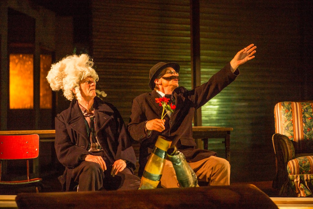 Ces olibrius nous sont désormais fraternels, fantômes bien présents, on les retrouve d’un spectacle à l’autre dans des nouvelles postures, dans des nouvelles figures. C’est cependant un nouveau chemin que François Tanguy traçait avec Par autan : on pourra désormais toujours rêver en imaginant vers quelles autres contrées il nous aurait mené. Quelque chose s’ouvre avec ce spectacle dont le titre, après Passim, Soubresaut et Item, a définitivement quitté les rives musicales (Choral, Orphéon, Coda, Ricercar, Onzième, etc.) et donne à entendre Robert Walser, Shakespeare, Kafka, Tchekhov, Dostoïevski et quelques autres. Pour bien enfoncer le clou (de la compréhension ?), un petit « livret de paroles » est distribué aux spectateurs… Toujours et plus que jamais, Brahms, Dvorak, Grieg, Scarlatti, Schumann entre autres se font entendre, alors même qu’un nouveau venu, le pianiste Samuel Boré, vient se mettre de la partie et ajouter à l’ordre/désordre du plateau. Autre dimension qui se fait jour, celle d’un certain humour lové au cœur de ce bric-à-brac si bien agencé.