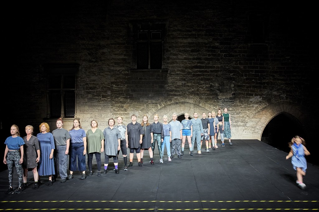 Le titre, d’abord, est on ne peut plus parlant : Mothers, A song of Wartime. Une chanson de temps de guerre, car nous y sommes bien déjà. Et c’est cela que le festival nous aurait offert. Dispositif bien en place : Marta Gornicka est au centre de la salle et dirige le chœur des femmes de tous âges, de 9 à 72 ans. Car oui, il s’agit bien d’un chœur, à la semblance enrichie d’un chœur antique, celui des tragédies grecques. C’est au départ en formation militaire de combat, en triangle, que toutes ces femmes, ces survivantes de guerre, vont chanter, scander tout un répertoire puisé dans le folklore et les chansons populaires venues d’Ukraine. Une formation de combat qui va s’ouvrir telle une fleur, dessiner différentes figures géométriques dues à Evelin Facchini dans le balancement entre la célébration de la vie, individuelle et collective, et le témoignage de ce que la guerre détruit au jour le jour.