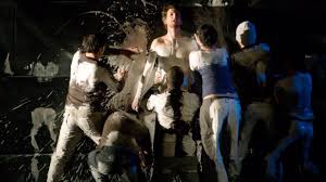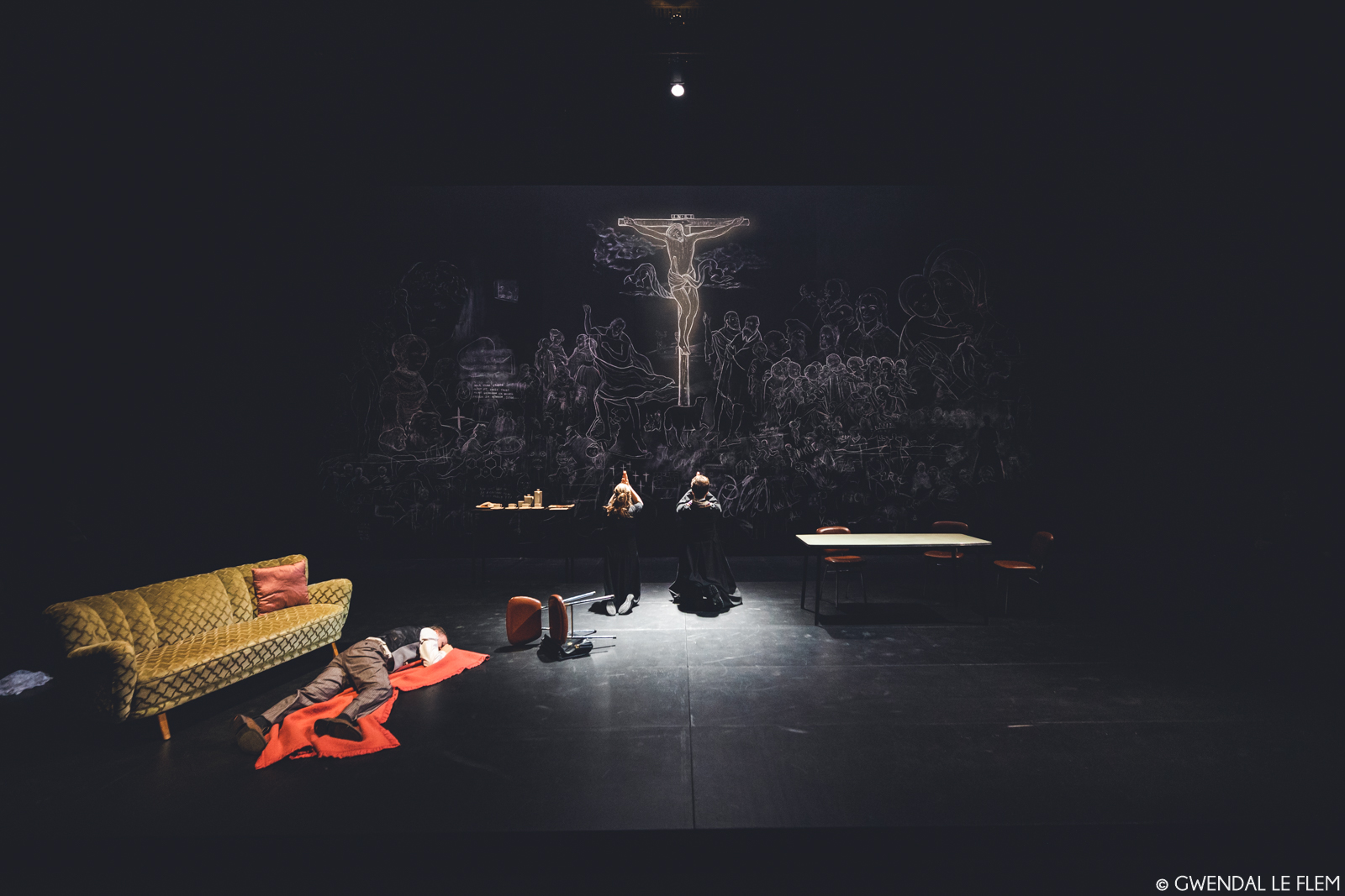Elles sont donc trois, comme dans les Bonnes de Genet, pour en arriver au même acte, soit un meurtre dans toute sa furieuse abjection. Ce n’est pas un hasard si la tragédie (c’en devient une) commence par l’écoute des trois femmes d’un discours du pape Jean-Paul II avant que, télé fermée dont les images se reflètent en grand sur le visage et le corps des intéressées, elles se mettent à jouer leur monstrueuse partition. Monstrueuse partition qui oscille entre solos et entrecroisements de voix et même affrontement des corps. Il fallait à tout le moins un excellent chef d’orchestre (metteur en scène) pour mener à bien cette œuvre musicale. Il s’agit de Laurent Fréchuret qui, avec son Théâtre de l’Incendie, a très vite annoncé la couleur de son travail.