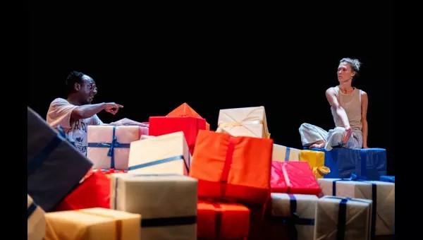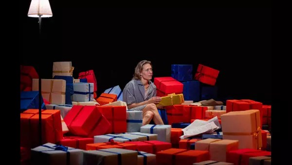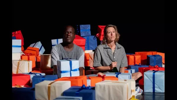 Les reproches aussi, de bouche en bouche, en accéléré. La phrase à peine finie de l’un, l’autre embraye à grande vitesse, normal pour celle qui opère dans l’industrie automobile ! La conversation s’envenime, les propos échangés ne sont plus très aimables, de vrais uppercuts distribués et encaissés en pleine face. « Peu importe », telle est la formule qui clôt au final chaque point de désaccord… Jusqu’au basculement, vicieusement imaginé par l’auteur allemand de ce brûlot, Marius von Mayenburg : c’est Erik qui rentre de déplacement cadeau en main, c’est Simone qui veille à la bonne tenue du foyer. Et les projecteurs à nouveau braquer sur le champ de bataille, les mêmes invectives inversées, les mêmes querelles ! Une lutte acharnée des deux protagonistes pour gagner raison, un affrontement cœur à corps au risque de débordements irréparables. De coups de pied en coups de colère, la montagne de cadeaux qui submerge l’espace s’effondre, les paquets voltigent comme les paroles échangées. Tout est dit sans reprendre souffle, la respiration suspendue, le couple suffoque sous les injonctions professionnelles et sociétales qui étouffent leur univers.