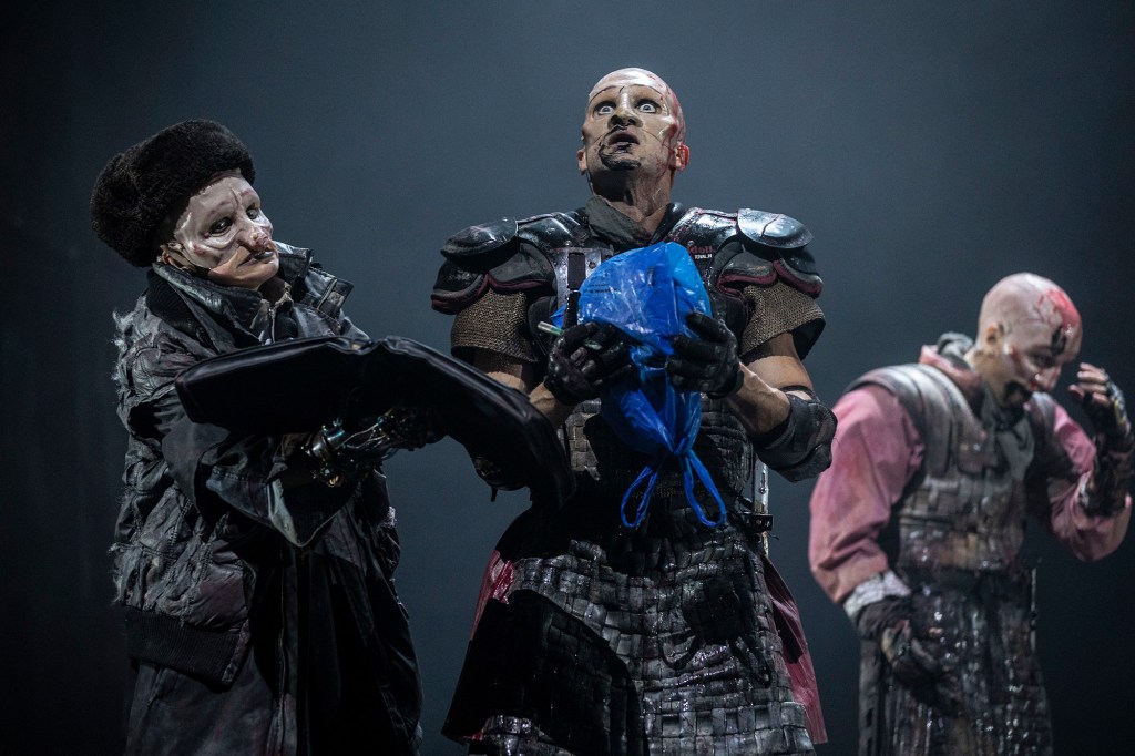 Sur la lande brumeuse, les combats font rage. Corps à corps sanglants, jets de grenades, explosions, incendies… Ambiance guerre de tranchée et film de cape et d’épée, avec costumes moyenâgeux, dans l’esthétique de la série Games of Throne. Un corps est planté dans la terre, tête en bas, pieds au ciel. Des bras volent dans les airs. Un soldat agonise tripes à l’air, le tout enveloppé de généreuses volutes de fumée… Certaines scènes rappellent les Désastres de la guerre de Goya. Une vision essentiellement picturale, à l’instar de tout le spectacle, succession de tableaux magnifiques. Quand les armes se sont tues, commence la pièce — que la superstition veut « maudite » — de Shakespeare, avec l’apparition, sur la route de Macbeth et Banquo, d’une créature surnaturelle indéterminée. Elle annonce au premier qu’il sera général puis roi, au second qu’il sera père de rois. La prophétie réjouit Lady Macbeth mais angoisse déjà son époux, saisi de mauvais pressentiments : « Macbeth a tué le sommeil ! ». On connaît la suite : le couple n’épargnera personne, l’assassinat de Duncan, roi d’Écosse étant le prélude à une sauvagerie en chaîne et un délire paranoïaque qui atteindront, dans cette adaptation, des sommets apocalyptiques.
