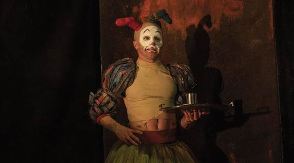 Ionesco avait modifié la graphie de son adaptation avec un double « t » final, ici c’est un « K » qui s’introduit dans le titre. Pour Louis Arene, qui signe la mise en scène, cette incongruité indique un décalage par rapport à l’œuvre originelle, une distanciation qu’opère aussi la traduction de Lucas Samain. On peut y voir aussi une allusion à Kafka ou encore un respect de l’orthographe du vieil anglais, qu’on trouve dans les Chroniques de l’historien anglais Raphael Holinshed, publiées en 1577, source majeure des pièces de Marlowe et de Shakespeare dont Macbeth, Le Roi Lear et Cymbeline. Pour insuffler une dimension comique à cette tragédie, l’une des plus sombres de l’auteur élisabéthain, l’adaptation se nourrit d’anachronismes, de situations et de personnages nouveaux. En particulier le fou qui traverse la pièce, sorte de transfuge du Roi Lear, personnage ambigu, sage, sarcastique et assassin à ses heures. Acrobate hors pair,Erwan Tarlet virevolte, en tutu et basket et, entre deux pirouettes, va même s’adresser, dans un mélange de français et mauvais anglais, aux universitaires spécialistes de Shakespeare qui se seraient fourvoyés dans cette salle : « Vous n’êtes pas au bout de vos peines ! » « C’est un spectacle triste ! » conclut-il.