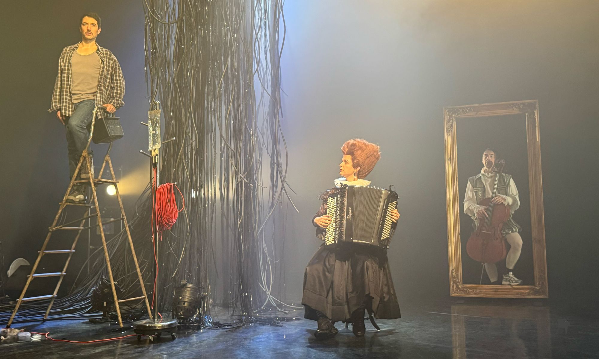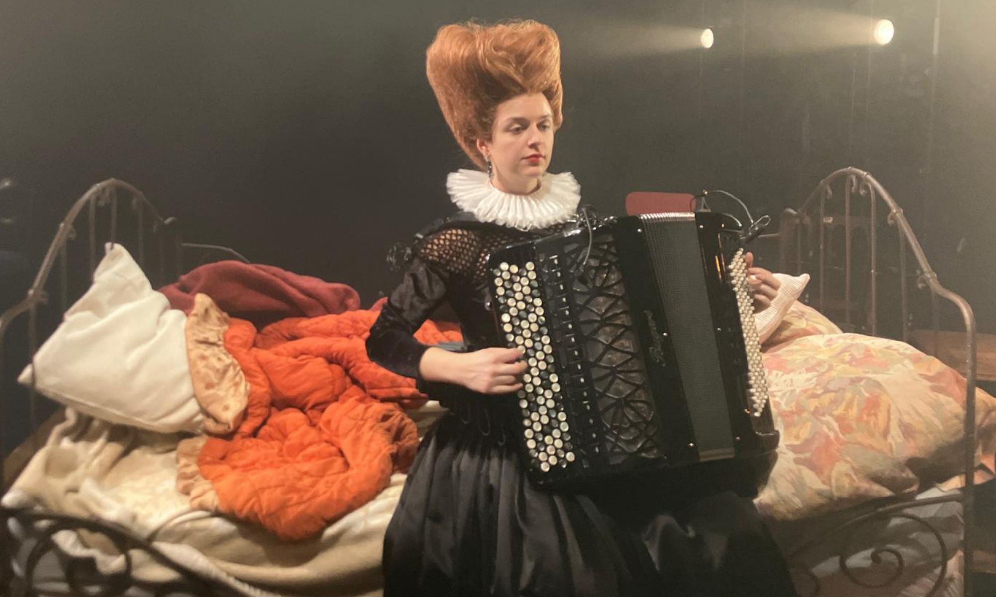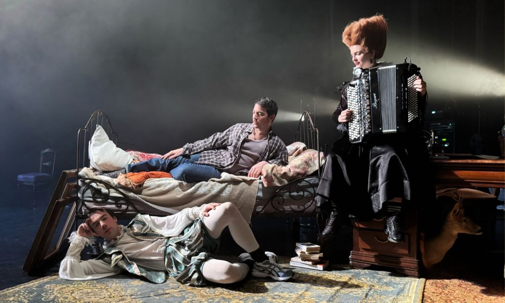 Le répertoire vocal, mis en musique par de grands compositeurs, magnifie littéralement la gravité essentielle de l’enjeu. Julia Sinoimeri, accordéoniste virtuose, vêtue de noir sous une haute couronne de cheveux roux, va et vient mélodieusement sur la scène où, côté jardin, Théodore Vibert, musicien expert en électroacoustique, semble inventer à vue des sons inouïs. Ce qui ne l’empêche pas, à point nommé, de prendre place dans le cadre doré où il figure « le frais ornement du monde », soit l’élu du poète. Cela se joue dans une scénographie (Aurélie Thomas) baignée d’une aura de mélancolie, sous de savantes lumières de clair-obscur (Olivier Oudiou), avec un lit où peut s’étendre le poète, ce rêveur sans trêve éveillé.