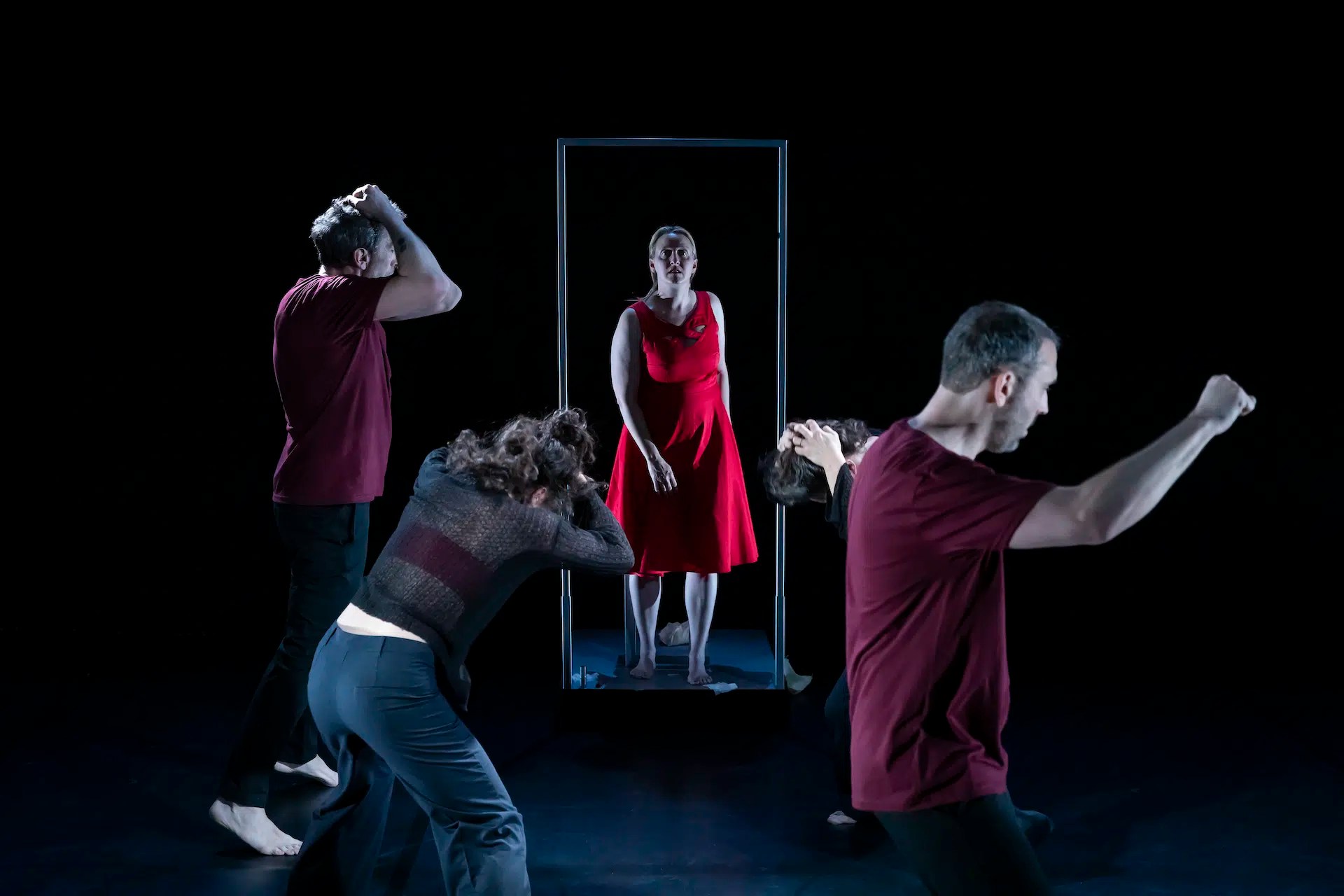 Les mots se perdent, se répondent, provoquant des malentendus savoureux. Alors on chante, une chanson ou un air d’opéra, toujours à contretemps, à contre-emploi. Rien de mieux qu’un chœur pour créer un peu d’harmonie même si, ici, la musique ne se contente pas d’adoucir les mœurs, ce serait trop facile. Les déplacements des acteurs-chanteurs – Liliana Benini, Charlotte Clamens, Raphael Clamer, Federica Fracassi, Lukas Metzenbauer et Graham F. Valentine – sont millimétrés dans une chorégraphie au cordeau où chaque geste, chaque mouvement, aussi lent et retenu soit-il, casse le rythme. Dans ce huis clos, les bruits du monde parviennent calfeutrés, étouffés. Les dirigeants en tenue d’apparat posent pour la photo de famille, l’air suffisant et content d’eux quand bien même ils n’ont rien résolu du grand bazar du monde, bien au contraire.