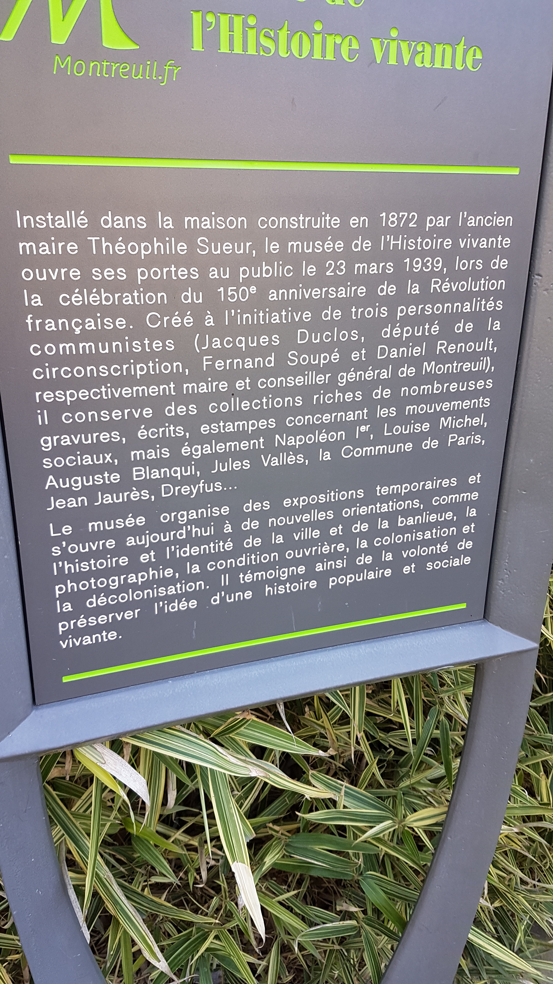 L’histoire peut avoir l’ironie facile et parfois cruelle. Théophile Sueur, industriel en cuir et peaux, a fait édifier en 1872 une gentilhommière au cœur d’un parc des hauts de Montreuil, à quelques encablures de ses usines. Pouvait-il imaginer que l’un de ses successeurs (il fut maire de la ville de 1866 à 1876, sautant allègrement du second Empire à la IIIème République), Hilaire Fernand Soupé, communiste bon teint qui rompra avec le PCF pour adhérer en 1940 au PPF de Doriot, convaincrait en 1937 le conseil municipal de se porter acquéreur de l’édifice. Deux ans plus tard, en 1939, le maire Soupé coupe le ruban de ce qui est devenu le Musée de l’Histoire Vivante, avec une exposition consacrée au 150e anniversaire de la Révolution, voué dès son origine à l’édification des masses par la narration de l’épopée communiste. Bon sang montreuillois ne saurait mentir. Et cela, sous les cheminées marquées des initiales encore visibles de Théophile Sueur !