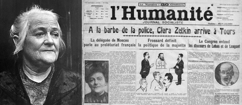 Il est 17 h ce 28 décembre 1920, lorsque la salle du Manège de Tours, où se réunit le XVIIIe congrès du Parti socialiste, est plongée dans le noir et les portes verrouillées. Une femme de 63 ans traverse la salle pour monter à la tribune accompagnée du chant de l’Internationale entonné par les participants, pratiquement tous masculins : Clara Zetkin, députée au Reichstag du tout jeune Kommunistische Partei Deutschlands (KPD) fondé deux ans plus tôt par Rosa Luxemburg et Karl Liebknecht. Celle qui s’est fait connaître depuis le début du siècle par ses combats pour les droits des femmes puis pour la paix est interdite de séjour en France au titre de sa nationalité, deux ans après la fin de la Première Guerre mondiale.