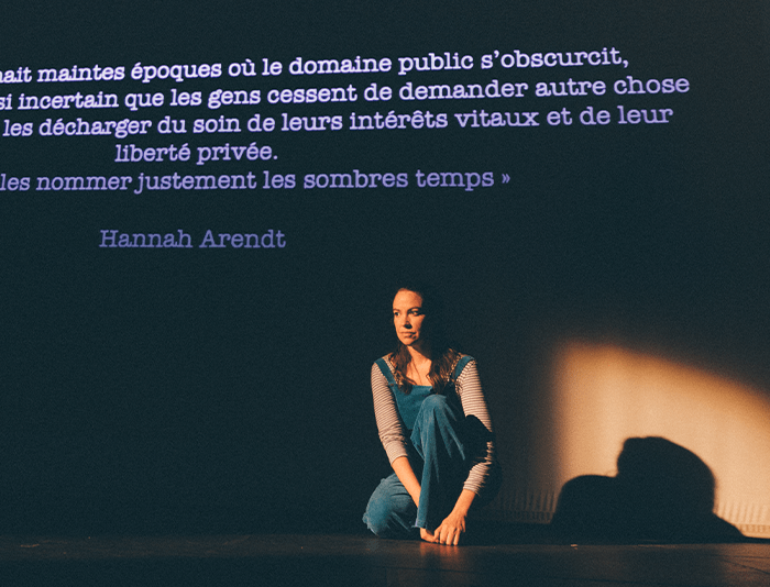 Faire ou ne pas faire du théâtre quand un génocide se déroule à quelques milliers de kilomètres ? Quand la planète brûle, quand la Méditerranée est un cimetière à ciel ouvert. Et oh, comment ça va, le monde ? Seule en scène, Audrey Vernon brave tout, la lâcheté, la couardise qui enveloppent le monde dans un linceul d’hypocrisie. Et cherche des points d’appui, histoire de ne pas crever « de faiblesse » comme aurait pu dire Romain Gary ; histoire de ne pas sombrer dans la sidération, le défaitisme. Dans une salopette bleu travail, elle va convoquer le Big Bazar et Hannah Arendt ; Chantal Goya et Hannah Arendt ; ses crises existentielles, environnementales ou féministes, les travaux dans sa cuisine et Hannah Arendt, toujours.