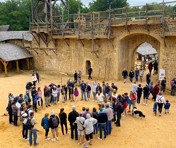 En 2025, les œuvriers poursuivent les maçonneries de l’imposante porte entre deux tours. Ils attaquent aussi la maçonnerie de la courtine Est avec la construction d’une nouvelle porte vers le village. Les charpentiers taillent et assemblent une passerelle piétonne reliant le château et l’escarpe Est . En forêt, les talmeliers, appellation médiévale du boulanger, proposent des cuissons de pain dans le four banal terminé l’année dernière.