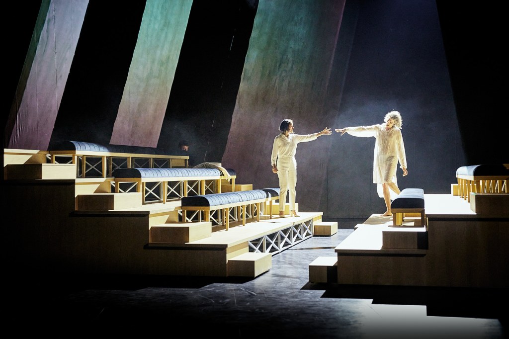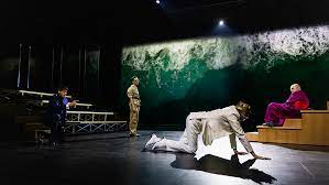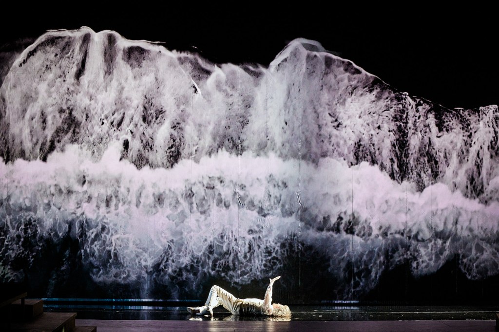 Tel est le parti pris de Christophe Rauck dans sa mise en scène, nerveuse, énergique, qui s’approche au plus près de tous ces enjeux. À grande fresque, grand plateau. C’est comme si le metteur en scène avait repoussé les murs du gymnase Aubanel pour laisser à découvert un immense plateau où sont disposés des gradins amovibles manipulés à vue, où des tulles vont délimiter et ouvrir les aires de jeu, et sur lesquels seront projetées quelques scènes en gros plans ou une mer déchaînée aux mouvements hypnotiques (scénographie d’Alain Lagarde). Si les enjeux de la pièce nous échappent quelque peu au démarrage – il est vrai que nous ne sommes pas anglais et que nous connaissons mal cette histoire –, nous sommes très vite rattrapés par la force qui émane de cette intrigue dont la figure centrale, Richard II, est portée par un Micha Lescot majestueux dans son costume blanc qui, de sa longue silhouette, domine la pièce de bout en bout. Incroyable acteur qui se métamorphose à vue, tantôt mélancolique, tantôt colérique, à la fois monarque qui inspire le respect pour soudain se comporter en enfant gâté. Imprévisibles, ses décisions prennent de court ce qui lui reste de cour, lui-même naviguant à vue au milieu des trahisons qui sont légion.