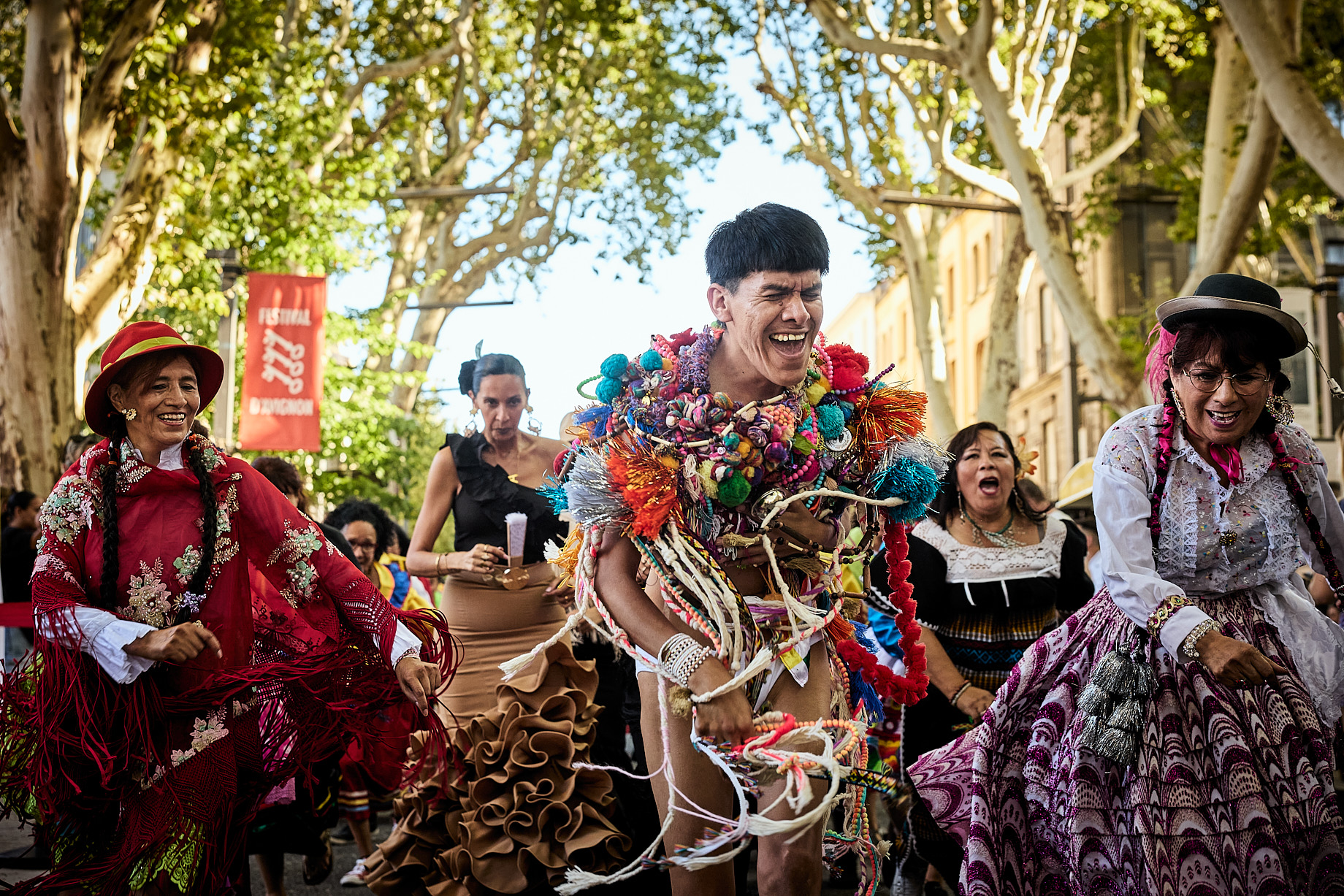 On est à la veille de la fin de cette 78e édition qui s’achève le 21 juillet. L’espagnol étant la langue invitée cette année, on a pu retrouver des artistes du Vieux Continent – Angelica Liddell ou La Ribot – et découvrir des voix venues de plus loin, du Chili, du Pérou, d’Uruguay ou d’Argentine. Après le spectacle de l’Argentine Lola Arias, Los dias afuera (lire notre édition du 8 juillet), ce fut au tour de Tiziano Cruz d’entrer sur scène. Qu’il soit face au public ou qu’il embarque les spectateurs dans une parade le long des remparts d’Avignon, Tiziano Cruz au Festival fait soudain entendre la voix des sans-voix, des sans-terre, des « sans-dents ». « Tout ce que vous voyez, je le suis. Vide de langue, vide de territoire. J’ai quitté ma maison pour fuir la pauvreté et la violence, j’ai tout quitté, absolument tout, pour appartenir à quelque chose. Je me suis laissé violer par les institutions du pouvoir », dit-il dans Soliloquio, adresse au public qu’il va réitérer dans Wayqeycuna.