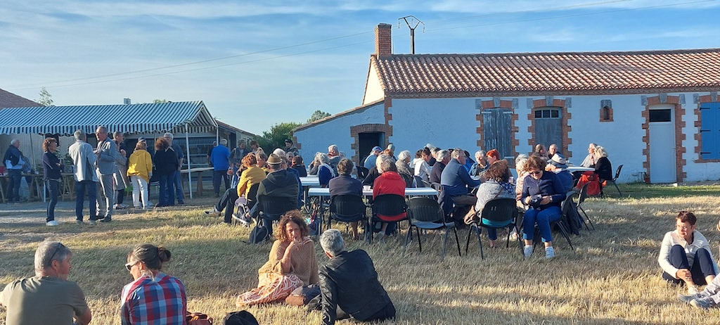 Comme à chaque étape de la tournée, une causerie autour de l’artiste précède le concert. Ici, elle est animée par les membres d’A.R.EX.C.PO. Il est question « la survie de la culture maraichine face à l’économie touristique ». Là où les « ébobés » demandent de la couleur locale, il faut proposer une culture vivante, loin de la caricature du paysan, dit Jean-Pierre Bertrand, l’un des fondateurs de l’association. « Pour qu’une culture existe sur un territoire, il faut de la création et non de la reproduction folklorique », acquiesce l’artiste : « I’est à vous de vous laisser crever ou pas ; si vous ne transmettez pas, vous êtes criminels, vous tuez votre langue ».