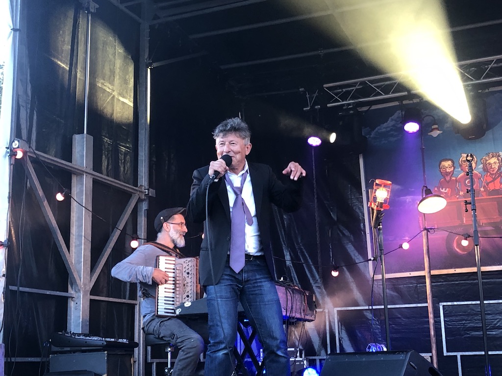 Jaulin et le Projet Saint Rock, sur leur tracteur-scène nous offrent un savoureux tour de chant d’une heure, qui oscille entre le folk, le rock, et le blues. Pascal Ferrari à la guitare électrique ou acoustique, Nicolas Meheust aux claviers et accordéon, ils développent un gros son qui laisse la part belle aux paroles de Yannick Jaulin, dans sa langue maternelle. En préambule, il se moque de ceux qui disent « Mais je ne vais rien comprendre !!! » et leur rétorque que personne ne se pose la moindre question en allant écouter du rock en anglais, langue mondiale et dominante.