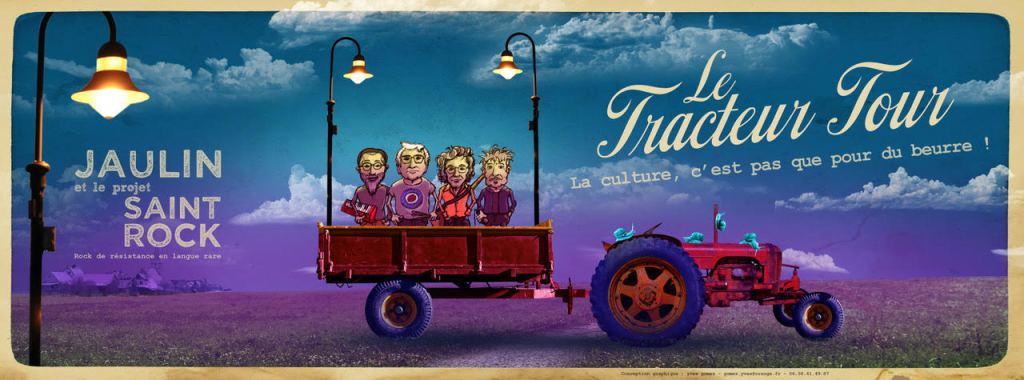 Jusqu’au 24/07, de la Vendée au Poitou-Charentes, Yannick Jaulin et les musiciens du Projet Saint-Rock battent la campagne. Un concert joué sur une scène mobile et repliable, remorquée par un tracteur. Un voyage au cœur de parlers oubliés.
