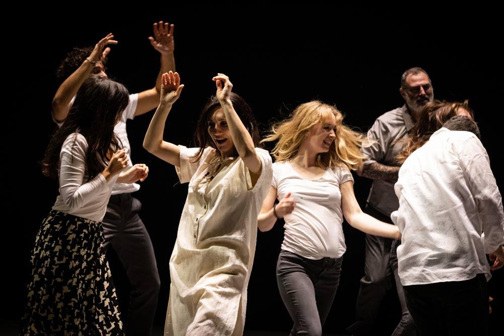 Le titre, d’abord, est on ne peut plus parlant : Mothers, A song of Wartime. Une chanson de temps de guerre, car nous y sommes bien déjà. Et c’est cela que le festival nous aurait offert. Dispositif bien en place : Marta Gornicka est au centre de la salle et dirige le chœur des femmes de tous âges, de 9 à 72 ans. Car oui, il s’agit bien d’un chœur, à la semblance enrichie d’un chœur antique, celui des tragédies grecques. C’est au départ en formation militaire de combat, en triangle, que toutes ces femmes, ces survivantes de guerre, vont chanter, scander tout un répertoire puisé dans le folklore et les chansons populaires venues d’Ukraine. Une formation de combat qui va s’ouvrir telle une fleur, dessiner différentes figures géométriques dues à Evelin Facchini dans le balancement entre la célébration de la vie, individuelle et collective, et le témoignage de ce que la guerre détruit au jour le jour.