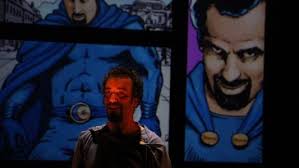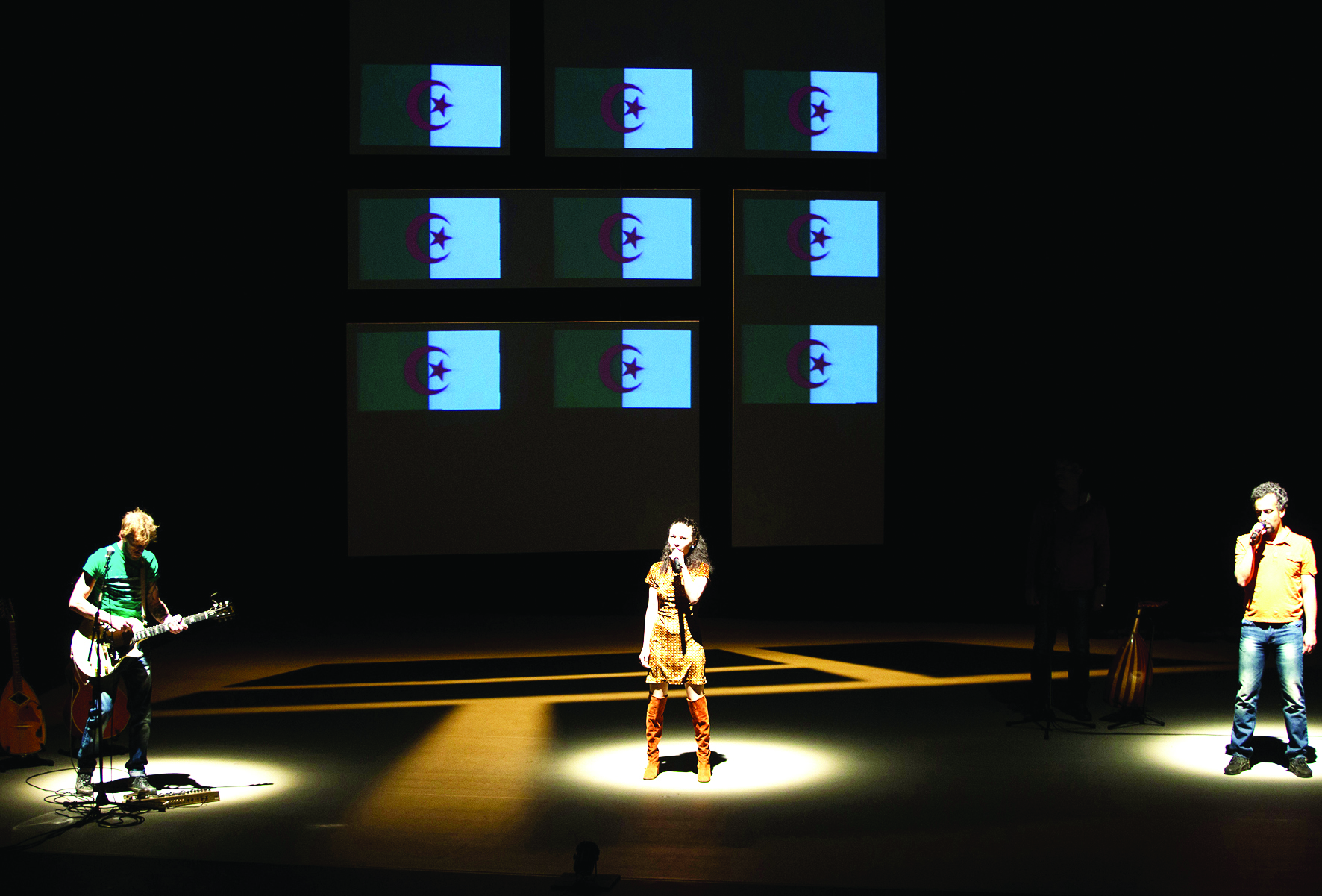 l’extraordinaire complexité des sentiments, émotions et propos échangés entre les divers protagonistes. En paroles, chants et musiques pour tenter de dévider l’histoire d’un metteur en scène aux origines algériennes mais jurassien, de Lons-le- Saulnier s’il vous plaît, qui commande à un auteur savoyard une pièce sur l’Algérie d’aujourd’hui. « Ou plutôt non, c’est l’histoire d’un auteur qui décide d’écrire sur Kheireddine, coincé ou perdu -selon- entre la France et l’Algérie. Non, voilà, c’est l’histoire d’Algéroman, super-héros maghrébin qui, cape au cou et justaucorps, se retrouve sommé de sauver son pays ! Mais lequel : la France ou l’Algérie ? »… Une aventure peu banale donc dans laquelle nous embarque, tel un grand gamin toujours hanté par les héros de son enfance, la compagnie El Ajouad : qui suis-je, d’où viens-je, où suis-je, où vais-je ? Autant de questions essentielles, existentielles, posées à même les planches du Théâtre de l’Aquarium, sans prise de tête ni logorrhée inaudible, juste chantées superbement et clamées sur le mode du conte, voire de la bande dessinée. Si l’enfant occidental peut aisément jouer au