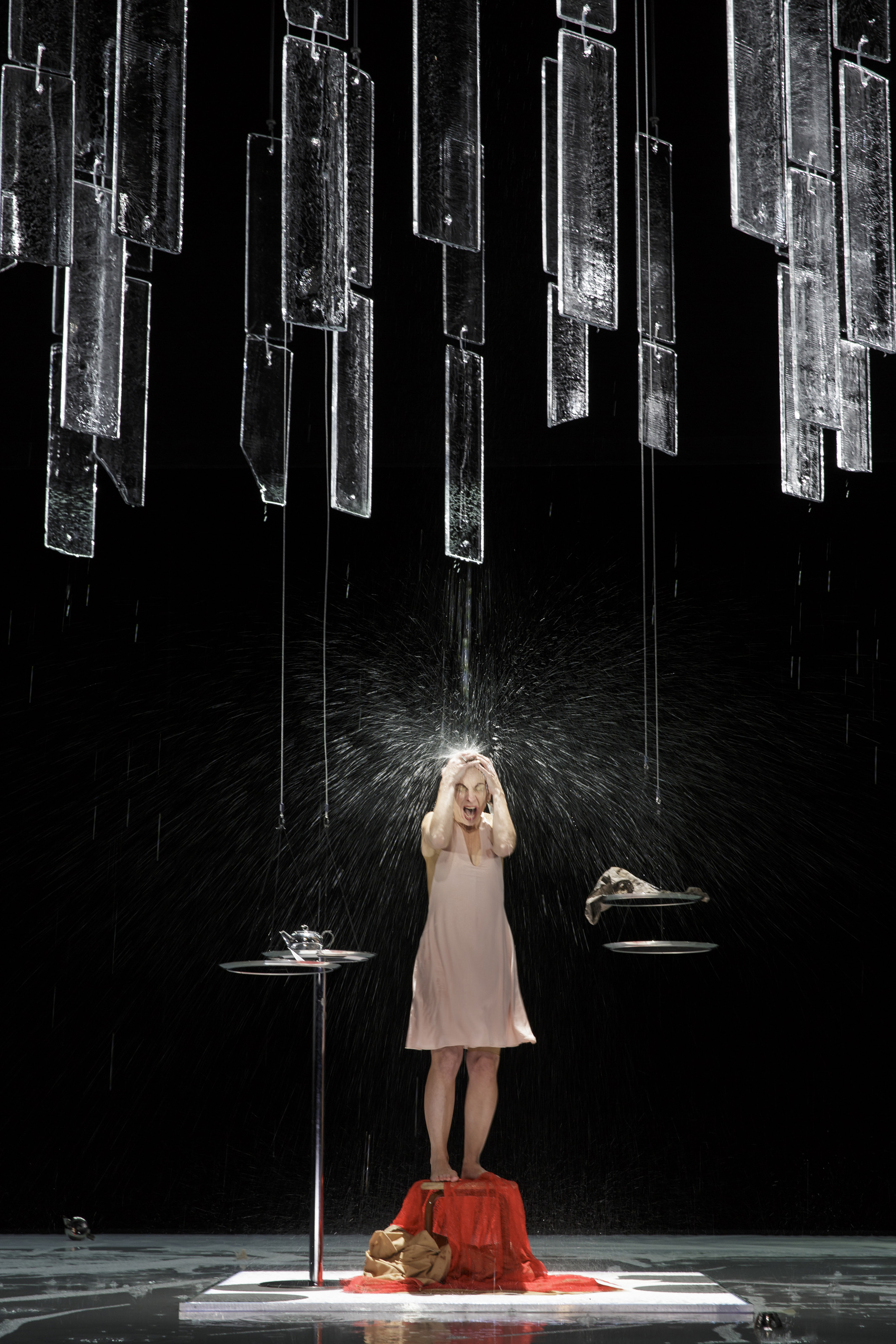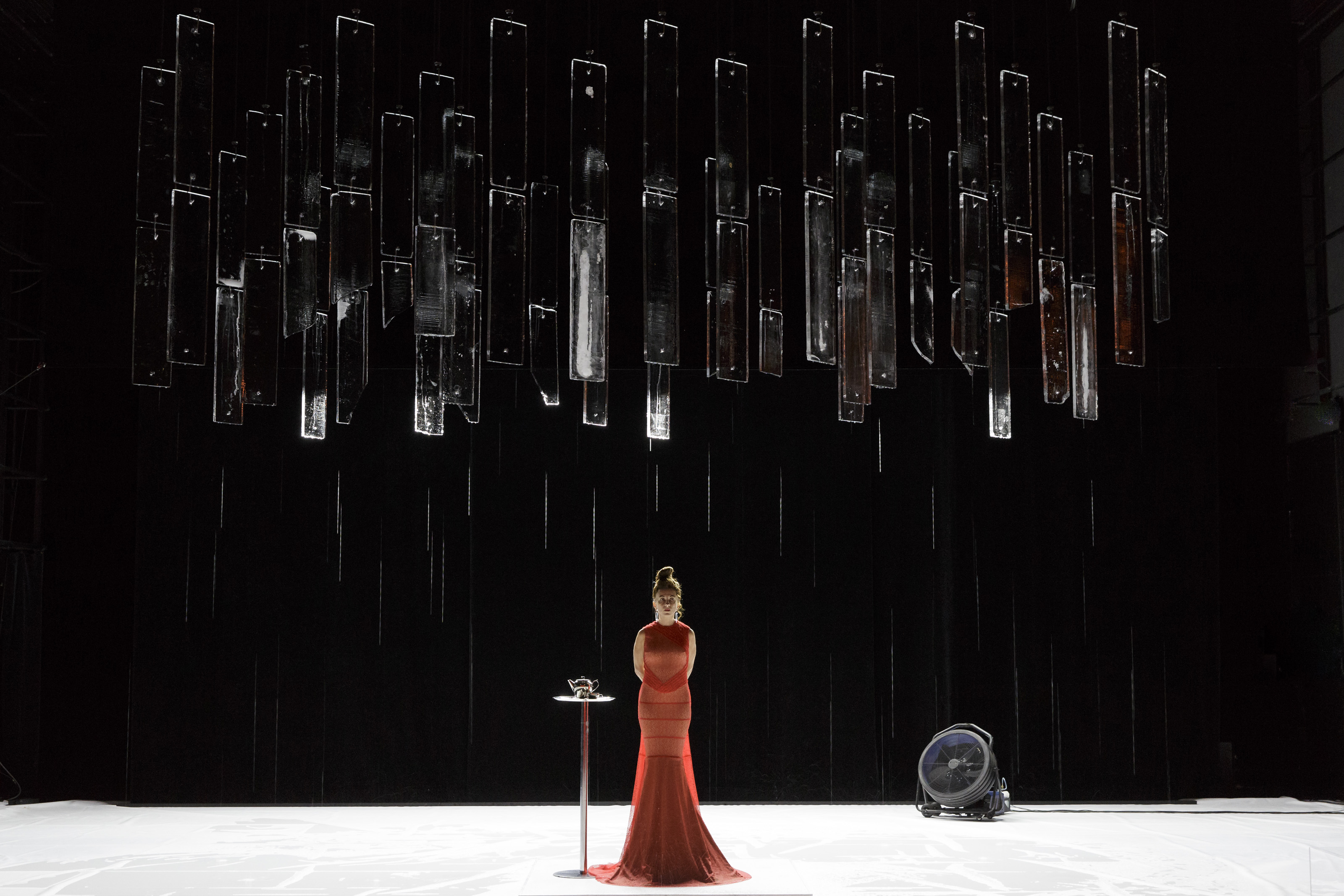 Solitaire, impavide sous des blocs de glace suspendus au-dessus de sa tête mais fondant au fil du temps et s’écrasant avec fracas sur scène, l’ex-cantatrice attend. Un homme, un ami, un