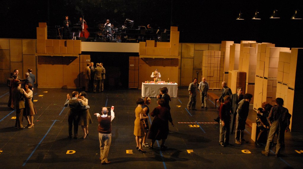 En fond de scène, l’orchestre rythme avec bonheur le passage d’un monde à l’autre : de la petite boîte à la grosse entreprise, des conflits de classe aux conflits d’intérêt. Rabelais s’invite à la fête avec ses procédés « torcheculatifs », Dumézil aussi au temps où Michel Vinaver suivait ses cours sur les mythes nordiques au Collège de France, mais encore l’antisémitisme qui avançait alors masqué dans cette France des années soixante. Par-dessus Bord ? Une œuvre de son temps qui le subvertit pour devenir parabole universelle, parole vivante de tout temps. Yonnel Liégeois