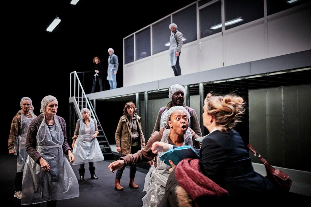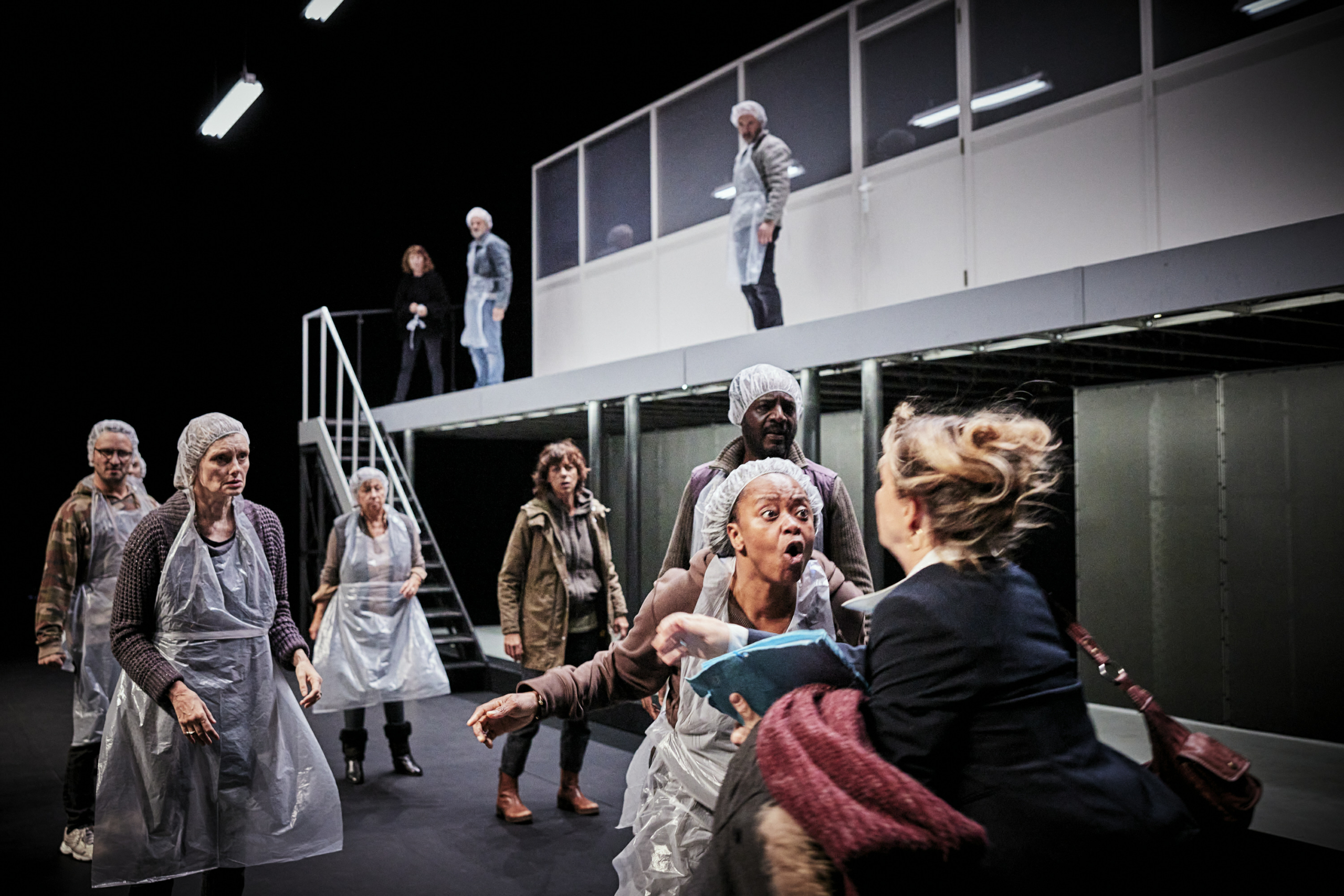 Une troupe à l’unisson de l’espoir retrouvé, l’espace d’un instant où l’on prend enfin le temps de se découvrir, de s’écouter, de s’apprécier ou de s’aimer : ensemble enfin, tous ensemble pour ne rien lâcher, plus jamais les uns à côté des autres à se croiser et s’ignorer ! Il était temps, guirlandes et chants, baisers échangés, la fête bat son plein. Qu’est-ce, alors, ces regards atterrés et mouvements désordonnés entre ouvriers toujours pas cuits et poulets bien rôtis ? Les hélicos de la gendarmerie tournoient dans le ciel, les forces de l’ordre se préparent à donner l’assaut. Dans les arrière-salles de l’entreprise, un bruit résonne, un coup de feu vient d’éclater… Noir de scène.