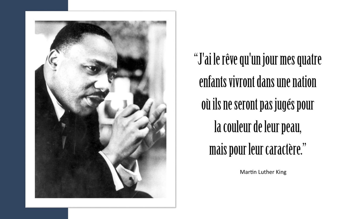 « Je fais le rêve d’une Amérique fraternelle, où blancs et Noirs se retrouveraient unis et libres. Nous sommes venus en ce lieu sacrifié pour rappeler à l’Amérique les exigeantes urgences de l’heure présente. Ce n’est pas le moment de s’offrir le luxe de laisser tiédir notre ardeur ou de prendre les tranquillisants des demi-mesures. C’est l’heure de tenir les promesses de la démocratie. C’est l’heure d’émerger des vallées obscures et désolées de la ségrégation pour fouler le sentier ensoleillé de la justice raciale. C’est l’heure d’arracher notre nation des sables mouvant de l’injustice raciale et de l’établir sur le roc de la fraternité. C’est l’heure de faire de la justice une réalité pour tous les enfants de Dieu...