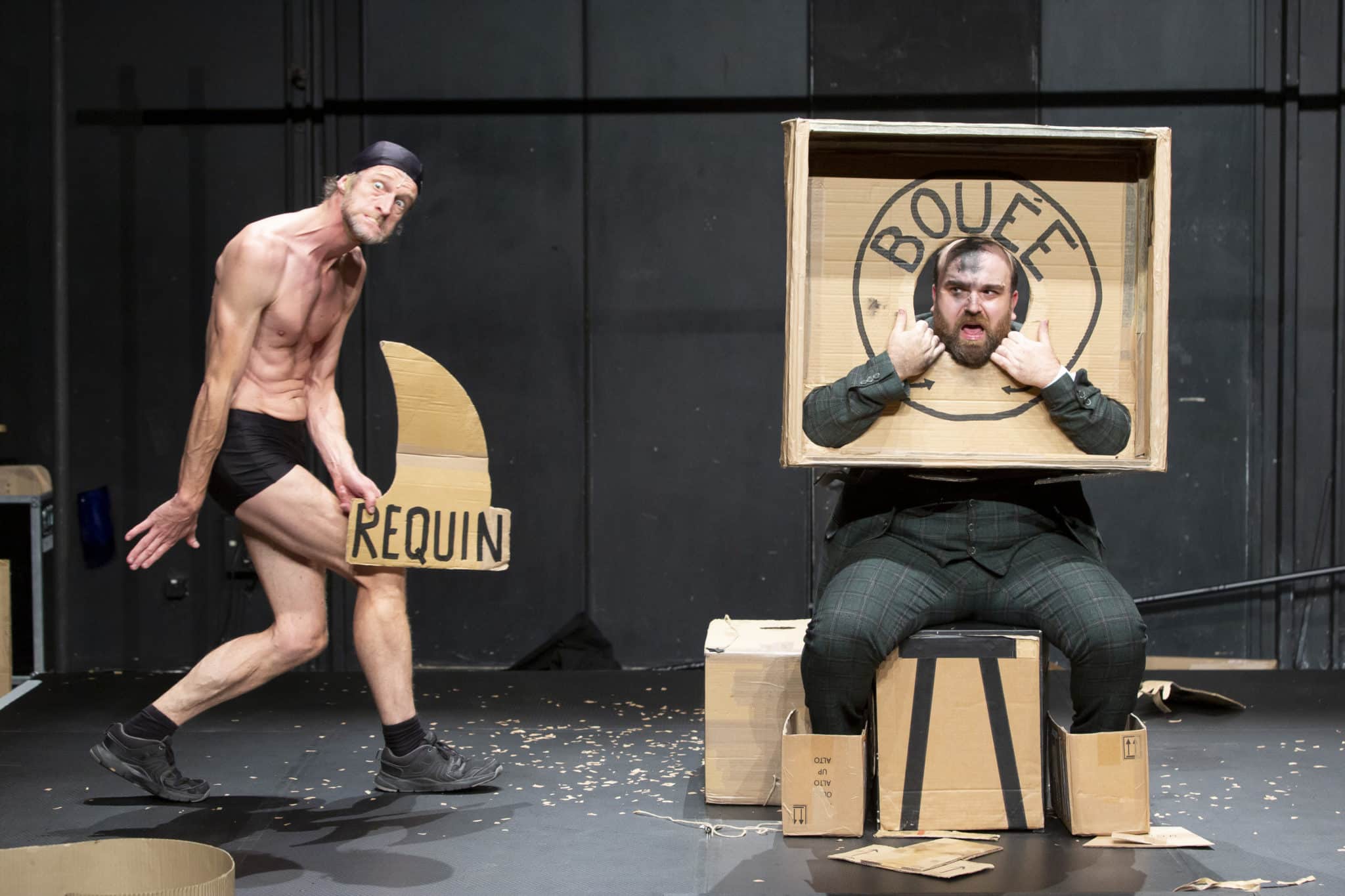 La mise en scène jette un éclairage vif sur l’homoparentalité, passé dans les précédentes lectures de la pièce pour un argument mineur. Ce qui ne faisait pas sujet alors surprend aujourd’hui par son aspect visionnaire. Alban-Zaza et Georges sont tous deux les pères de ce garçon qui s’apprête à quitter le nid familial. Interprétés par Laurent Lafitte et Damien Bigourdan, ils forment un duo chic et choc qui échappe à la caricature pour jouer la sensibilité sans pleurnicherie, la féminité loin des clichés efféminés, l’amour et les chagrins qui rythment la vie de tout couple. Pendant deux heures et demie, on nage dans la flamboyance, dans la démesure, à tout point de vue, l’émotion à fleur de larmes. Les décors, somptueux, de Pierre-André Weitz, tournent et nous projettent tour à tour au cœur du cabaret, dans les loges, les coulisses, l’appartement familial ou sur un bord de mer totalement kitsch avec des paysages peints sur toile de Saint-Tropez. Weitz a aussi dessiné les costumes, qui ruissellent de paillettes et de strass.