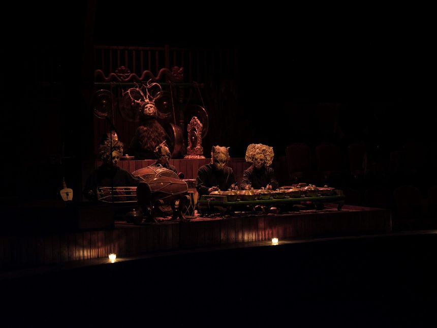 Sur les petites tables disséminées autour de la piste, bougie, vin chaud et petits gâteaux accueillent le public. Tendre la main à l’aveugle pour ne point quitter des yeux la sérénade verbale et musicale ! Dans l’eau, au milieu de l’eau s’enchaînent tableaux vivants et scènes de vie, superbement parées et mises en lumière. Le minotaure minaudant avec l’enfant, la danse envoûtante d’une belle féline qui roule et s’enroule autour d’elle-même, jusqu’au bout des doigts et les pieds dans l’eau, des torches vivantes et virevoltantes mais aussi des squelettes caracolant sur la croupe des chevaux… La vie est là, la mort aussi, l’homme a rompu le pacte avec le vivant, sa bestialité a coloré l’eau rouge sang, asservir l’animal et la terre conduit inéluctablement au néant. Le dépaysement est complet, tambours, chants et instruments balinais scandent le tempo de cette originale chorégraphie naturaliste. De temps à autre, le cheval entre dans la danse, toujours aussi libre de ses mouvements. Chez Zingaro c’est lui qui dicte la cadence, le dressage est caresse, assentiment.