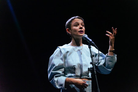 Laurène Marx orchestre la partition avec justesse. Seul un micro sur pied, des gestes mesurés, de judicieux clins d’œil au regard du public, quelques chansons fredonnées, Johnny le chien très présent dans l’imaginaire de la récitante… Le rire, bienvenu, évite de sombrer dans le pathos le plus morbide, la flûte traversière de Jessica Guilloud scande avec grâce ce « seule en scène » qui donne fort à penser. Sur le désir de « raconter toutes les histoires et pas juste celle qui nous arrange », sur les questions de classe et de féminisme, sur l’enjeu impérieux de ne point oublier d’où l’on vient sur le chemin où l’on va. Yonnel Liégeois