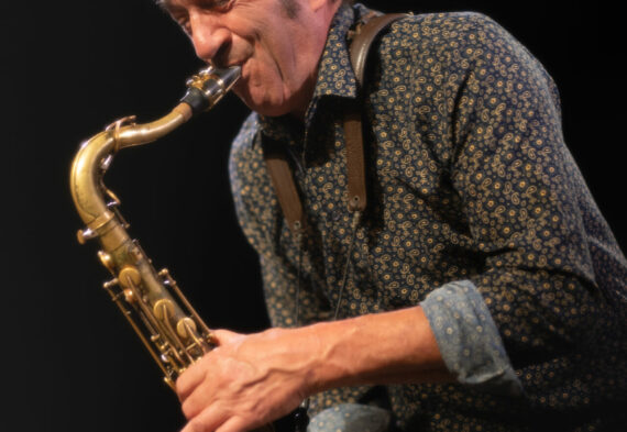 Devant son panneau de feuilles blanches, comme désemparée et prenant l’auditoire à témoin, la femme hésite puis se ravise. Griffonnant au feutre noir les mots-clefs de la conférence dont elle va nous abreuver… Pour l’heure, aux aguets mais l’instrument toujours silencieux, un saxophoniste veille au bon déroulé de la soirée.