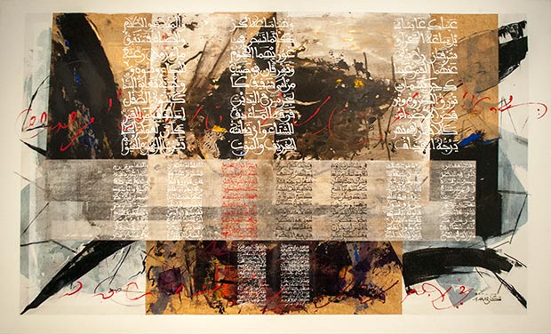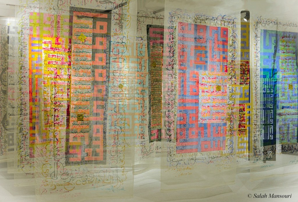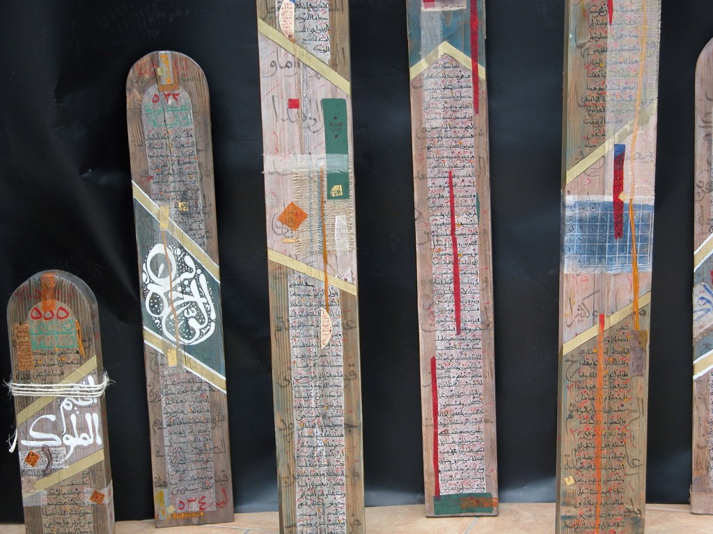 Ainsi, l’installation dans une église de Blois de quatre planches à peine équarries sur lesquelles se déploie la sourate XIX du Coran, celle consacrée à Marie, ainsi son Hommage aux Muallaqu’àt, les célèbres poèmes antéislamiques devenus sous sa plume « Poèmes suspendus » : de grand format, seize textiles calligraphiés ! Du grand art, quand le trait et le mot s’unissent en un grandiose mariage des formes et des couleurs.