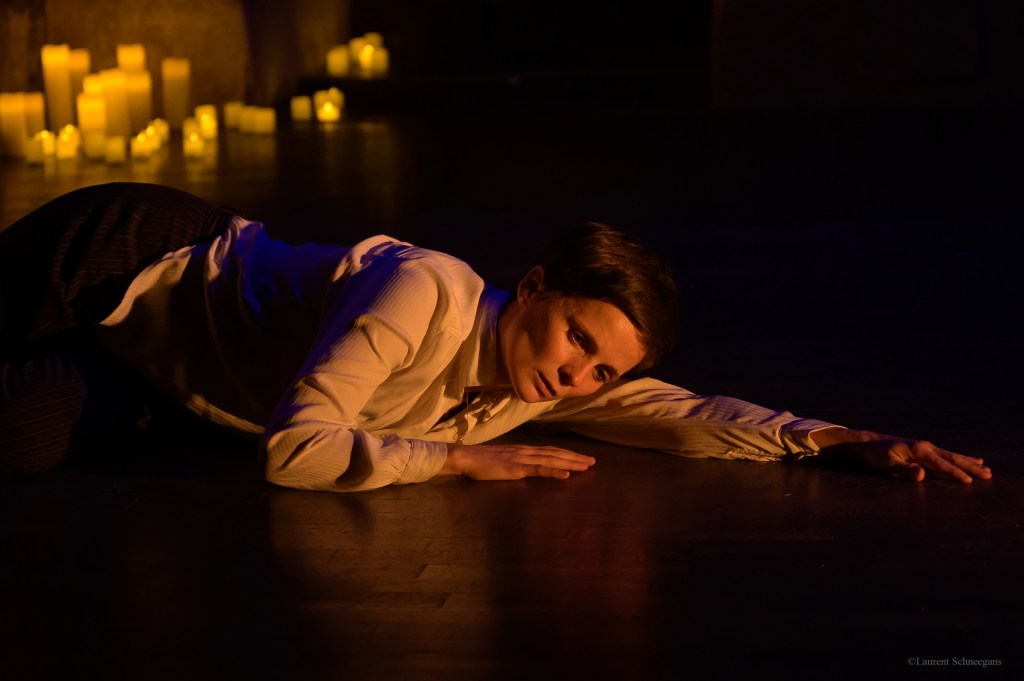 Elle s’avance dans la pénombre, seules quelques bougies éclairent la scène. Claudiquant nu-pieds, désarticulée, comme égarée sous le poids de la misère et des gifles que lui assène sa mère… Les mots sont pâteux, goûteux en ce parler populaire des années 1900, une poésie rebelle dont s’empare Agathe Quelquejay avec gourmandise, bouleversante de naturel et de sincérité. Un spectacle incisif et persuasif, qui ne dure que le tour du cadran, mais quelle prestation : flamboyante dans sa simplicité, foudroyante dans sa vérité ! De la gamine maltraitée à la mère qui geint sur la tombe de son gamin guillotiné, nous est offerte la déclamation de cinq poèmes extraits du Cœur populaire, le second recueil de Rictus.