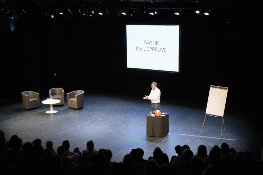 De la performance théâtrale à l’exposé Powerpoint sur grand écran, Frédéric Ferrer est un trublion inclassable sous son sérieux professoral. Qui tire à bout touchant sur la discipline sportive qu’il met en lumière, tend la perche entre vérités historiques et performances athlétiques, saute d’un trait d’humour à une référence érudite à la vitesse d’un coureur de 110 mètres haies, avec la prestance du lanceur de disque : toujours plus vite, toujours plus fort, toujours plus haut, toujours plus inattendu, la surprise au dernier bavardage comme la chute à l’ultime virage, l’éclat de rire qui vous coupe le souffle comme l’uppercut en plein visage ! Il est ainsi, le dénommé Ferrer, un puits de connaissances sous ses airs de gendre de bonne famille, chemise blanche et petites lunettes rondes. Qui vous révélera tout, sans jamais avoir osé le demander, et pour cause sur ce qui ne vous intéressait pas vraiment jusqu’à maintenant, sauf que, jeux olympiques oblige…
